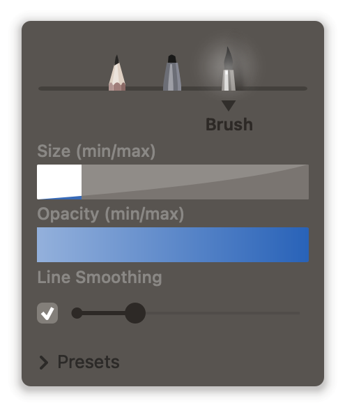 Line Smoothing on Brush drawing tool. In Animation Paper we have a general smart stabilizer that works at all time on all drawing tools, however, for your final inking, more control is needed. So we have added a simple smoothing option to the Brush. You can adjust how far behind it drags, meaning how much smoothing you get on your strokes.